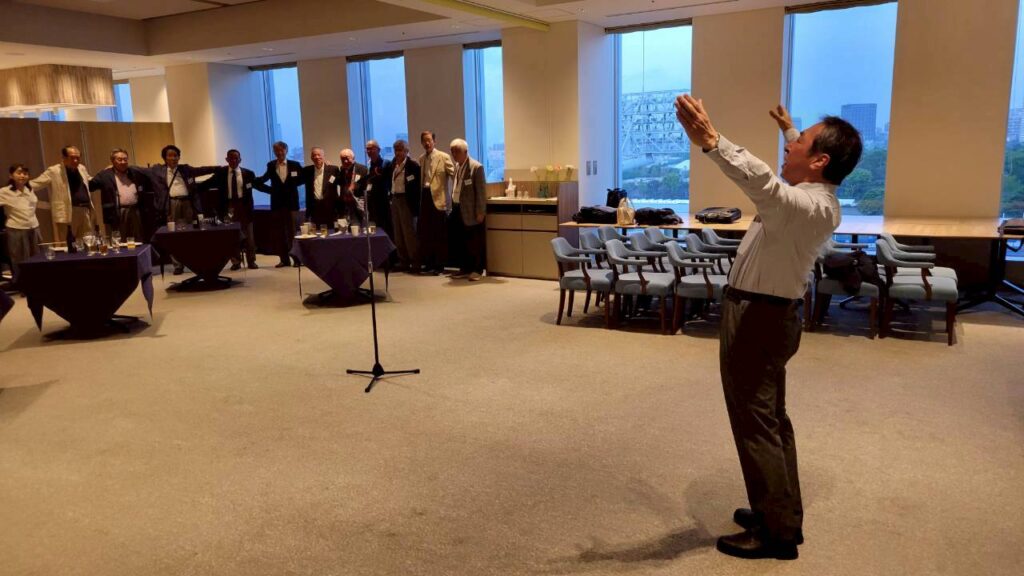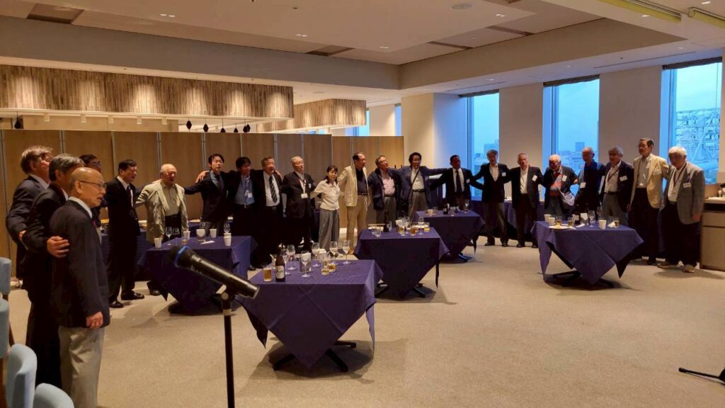 総会、懇親会の締めとして、恒例により高山敦会員のリードによって全員で肩を組み「若き血」を斉唱し、集合写真を撮影後散会しました。