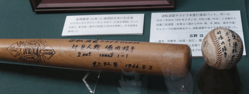 こちらは広野功(徳島商→慶大)のホームランボールと当該打席での使用バット。ルーキーイヤーの1966年の8月2日に、巨人の堀内恒夫から逆転サヨナラ満塁ホームランを放った際のものになります。(当時は中日に在籍)