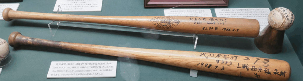 バット全体。なお下部のバットは高井保弘(阪急)が通算27本目の代打ホームランを記録した際のものです。27代打ホームランは世界記録となっています。
