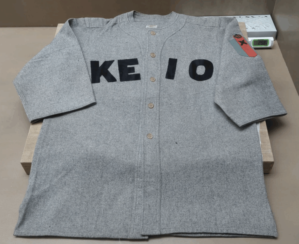 このユニフォームは水原茂(高松商→慶大)が在学中の1933年に着用していたものだそうです。1933年と言えば「水原リンゴ事件」があった年ですね。10月22日に起きたこの騒動をきっかけに、慶早戦のベンチは慶應が三塁側・早稲田が一塁側と固定されるようになったという説があります。(『早慶戦110年史 SINCE1903』 ベースボール・マガジン社 2013年 には別説が紹介されています)