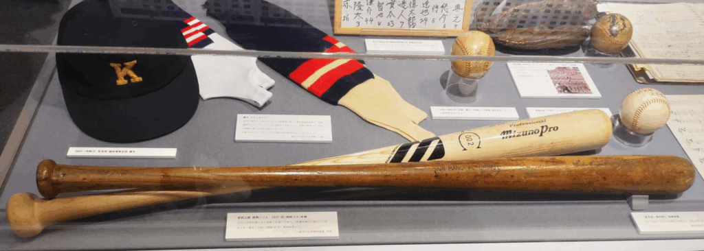 下部の茶色のバットは宮武三郎(高松商→慶大)が使用していたバットです。宮武の通算7本塁打は前述した長嶋に抜かれるまでリーグ記録でした。通算72打点も、前述した田淵に抜かれるまでリーグ記録。なお現在は岡田彰布(北陽→早大)の81打点がリーグ記録です。また投手としても38勝6敗をマークしています。慶大の投手としては最多記録であり、20勝以上の投手では最高の勝率を誇っています。プロでは阪急軍の初代主将を担当。阪急東宝グループの創業者である小林一三が慶應塾員だったこともあってか、阪急軍は設立当初は慶應色が強い球団でした。